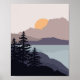 Abstrakte Illustration von farbenfroher Bergsee-Sonnenaufgang mit Sonne, Berggipfeln und Pinienbäumen Dekoration für alle, die Natur, Camping, Wandern etc. mögen.