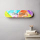 Farbenfrohe blaugelbe Orangennamenskateboard mit abstraktem Aquarellmuster und der Möglichkeit, Namen hinzuzufügen.