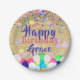 Farbenfrohe Confetti und Balloons glücklich zum Ge Pappteller