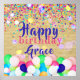 Personalisiertes Geburtstagsplakat mit bunten Konfetti und Ballons auf einem alten Papierhintergrund. Der Text ist vollständig anpassbar.
