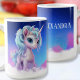 Farbenfrohe Einhornname Tasse. Mit einem niedlichen Einhorn auf einer Seite. Auf der anderen Seite Ihr personalisierter Name. Rund um einen farbenfrohen und lebhaften Himmel mit Sternen und Wolken. Das perfekte Geschenk für einen Einhornliebhaber - nachdenklich und persönlich. Es gibt verschiedene Farbkombinationen.
