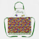 Das Design zeigt den Hintergrund einer Collage von Obst. Das obere Design zeigt anpassbaren Text in einer waldgrünen Schrift vor einem weißen Hintergrund. Das Bild von Blattwerk, Trauben, Erdbeeren und Birnen erscheint rund um die Schrift. Am unteren Rand wird ein Streifen aus Blättern angezeigt. Auch in blau und rot erhältlich.