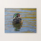 Ein unverwechselbares Bild einer männlichen Holzente, während sie in sanftem Morgenlicht auf dem gewölbten Wasser schwimmt.