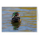 Ein unverwechselbares Bild einer männlichen Holzente, während sie in sanftem Morgenlicht auf dem gewölbten Wasser schwimmt.