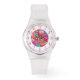 Farbenfrohe Imitate Stickereien Floral Elegant Womans Uhren bietet eine trendige farbenfrohe moderne Imitate Stickerei Blumenmuster in Rosa, lila, Orange, Blau und Gelb. Erstellt von Evco Studio www.zazzle.com/store/evcostudio