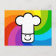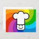 Einfache Abbildung des Kopfes eines Cartoon Koch über einem farbenfrohen, sich drehenden Hintergrund.