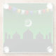 Farbenfrohe Illustration mit einer festlichen Garage in einer magischen Nachtszene mit einer Moschee Silhouette und dem Mond und den Sternen auf einem grünen Nachthimmel.