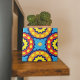 Einzigartige, lebendige dekorative Kachel mit sich wiederholenden geometrischen Formen in Blau, Türkis, Gelb und Rot.