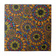 Diese Keramik-Kachel weist aufwändige mandalaähnliche Motive mit exquisiten Details auf, die einen kaleidoskopischen Eindruck vermitteln. Die Kachel weist zwei Hauptmuster auf: eine, die einer strahlenden Sonne ähnelt, und eine andere besteht aus komplizierten geometrischen Figuren, die in kreisförmigen Konfigurationen angeordnet sind. Gelb, rot, blau und schwarz dominieren die Farbpalette, die hell und farbenfroh ist. Jedes Design ist schwarz markiert, um den Kontrast zu erhöhen und die Farben Pop zu machen. Die sorgfältige Geometrie und die lebhafte Farbwahl verleihen der Kachel ein eklektisches Aussehen, was sie zu einem herausragenden Element macht, das jede Umgebung beleben und künstlerisch verbessern kann.