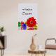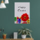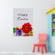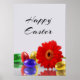 Happy Oaster Illustration mit farbigen, folienumhüllten Schokoladeneiern und einer roten Gerbera-Blume auf einem hellgrauen Hintergrund.