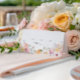 Farbenfrohe pastellfarbene Platzkarte mit Blumenmotiven in Aquarellfarben.