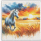 Ein anmutiges Pferd Galopp durch goldene Weizenfelder, mit einem dramatischen Sonnenuntergang, der den Himmel in lebhaften Farbtönen Orange und Blau erhellt. Im Hintergrund befinden sich Ställe und Vögel, die fliegen und eine ruhige ländliche Atmosphäre schaffen.