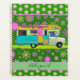 Ein farbenfroher, klassischer Trainer-Camper, der in Türkisblau, Kalkgrün, Mandarine-Orange und Rosa spielt, sitzt vor einem fröhlichen Hintergrund der Mod-Blume. Der Hintergrund mit Retro-Blumen ist Avocado-grün, Kalkgrün, hellrosa, violett und lila. Auf der Vorderseite befindet sich eine Vorlage, in der Sie einen Namen oder einen anderen Text hinzufügen können. Das niedliche Retro-Blumenmuster befindet sich ebenfalls auf der Rückseite des Planers. Dies könnte ein lustiges Reisebuch sein, besonders für jemanden, der Fahrten oder Camping Lieben.