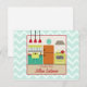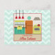 Eine Postkarte für Rezepte, die eine inspirierte Küche im Retro-Stil mit Rot-, Türkis-, Gelb- und Orangetönen zeigt. Personalisieren Sie den Text mit Ihrem Namen. Hintergrund ist hellblau mit Zickzacken. Gegenüber ist leer.
