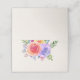 Eine Hochzeitstisch-Platzkarte mit einem fantasievollen Blumenstrauß mit Aquarellfarben-Rose. Stilvoll, skurril und kreativ. Ein Bündel von Rose in Rosa, lila und Gelb. Mit viel Grün und Blätter in Grün, Rosa, lila und Blau. Hintergrund ist eine cremefarbene Champagnerfarbe.