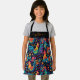 Moderne Mädchen Schürze mit einem farbenfrohen blumigen Hahnenmuster auf schwarzem Hintergrund und einem femininen, handgeschriebenen Schriftnamen. Personalisieren Sie mit Ihrem Namen.