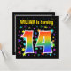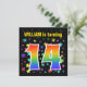 Dieses aufregende, lustige und lebendige Geburtstagsfeierdesign zeichnet sich durch ein farbenfrohes Sternenmuster aus, zusammen mit der Zahl "14" mit einem farbenfrohen Regenbogen-inspirierten Spektrum oder Farbverlauf. Der Name auf der Vorderseite kann angepasst werden. Auf der Rückseite finden Sie anpassbare Details zum Party. Einladungen für Geburtstagsfeiern wie diese können potenziellen Teilnehmern für eine Geburtstagsparty geschickt werden, die zur Feier des vierzehnten Geburtstages von jemandem abgehalten wird. [~Z0000349]