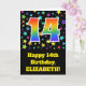 Die Vorderseite dieses aufregenden, lustigen und lebendigen Geburtstagskarten-Designs zeigt ein farbenfrohes Sternmuster, zusammen mit der Zahl "14" mit einem bunten Regenbogenspektrum wie Farbverlaufsmuster auf schwarzem Hintergrund. Auf der Vorderseite befindet sich auch eine Geburtstags-Grußnachricht, einschließlich eines benutzerdefinierten Empfängernamens. Im Inneren befindet sich eine benutzerdefinierte Geburtstagsgrüßbotschaft, oder man könnte sie löschen und leer verlassen werden, wenn eine Nachricht von Hand geschrieben werden soll. Eine personalisierte Geburtstagskarte wie diese ist vielleicht eine lustige Art, Geburtstagwünsche an jemanden zu senden, der seinen vierzehnten Geburtstag feiert. [~Z0000348]