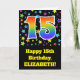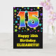 Die Vorderseite dieses aufregenden, lustigen und lebendigen Geburtstagskarten-Designs zeigt viele farbenfrohe Sterne, zusammen mit der Zahl "15" mit einem farbigen Regenbogen-inspirierten Farbverlaufsmuster auf schwarzem Hintergrund. Auf der Vorderseite befindet sich auch eine Geburtstagsgrüßbotschaft mit einem personalisierten Empfängernamen. Im Inneren befindet sich eine individuell angepasste Geburtstagsgrüßbotschaft, oder man könnte sie löschen und leer verlassen werden, wenn eine Nachricht von Hand geschrieben werden soll. Eine individuell anpassbare Geburtstagskarte wie diese könnte eine lustige Art sein, jemandes fünfzehnten Geburtstag zu bestätigen. [~Z0000348]