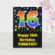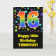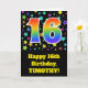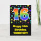 Die Vorderseite dieser aufregenden, lustigen und lebendigen Geburtstagskarte zeigt ein farbenfrohes Sternenmuster, zusammen mit der Zahl "16" mit einem bunten Regenbogen-inspirierten Farbverlaufsmuster auf schwarzem Hintergrund. Auf der Vorderseite befindet sich auch eine Geburtstags-Grußbotschaft, die auch einen benutzerdefinierten Empfängernamen enthält. Im Inneren befindet sich eine individuell anpassbare Geburtstags-Grußnachricht, oder vielleicht kann gelöscht und links werden, wenn eine Nachricht von Hand geschrieben werden soll. Eine personalisierte Geburtstagskarte wie diese könnte eine lustige Art sein, eine Botschaft zum Feiern des sechzehnten Geburtstages von jemandem zu senden. [~Z0000348]