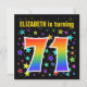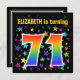 Dieses lustige, aufregende und lebendige Geburtstagsfeierdesign zeichnet sich durch ein farbenprächtiges Sternmuster aus, zusammen mit der Zahl "71" mit einem farbenfrohen Regenbogenmuster wie Spektrum oder Farbverlauf. Der Name auf der Vorderseite kann personalisiert sein. Auf der Rückseite finden Sie anpassbare Details zum Party. Geburtstagsfeierlichkeiten wie diese werden vielleicht geschickt, um Gäste zu einer Geburtstagsparty einzuladen, die zum Feiern des einundsiebzigsten Geburtstages von jemandem veranstaltet wird. [~Z0000349]