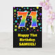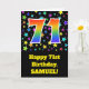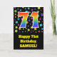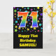 Die Vorderseite dieses aufregenden, lustigen und lebendigen Geburtstagskarten-Designs zeigt ein farbenfrohes Sternmuster, zusammen mit der Zahl "71" mit einem farbigen Regenbogen-inspirierten Farbverlaufsmuster auf schwarzem Hintergrund. Auf der Vorderseite befindet sich auch eine Geburtstags-Grußnachricht, einschließlich eines benutzerdefinierten Empfängernamens. Im Inneren befindet sich eine personalisierte Geburtstagsgrüßbotschaft, oder man könnte sie löschen und leer verlassen werden, wenn eine Nachricht von Hand geschrieben werden soll. Eine solche individuelle Geburtstagskarte könnte eine lustige Art sein, Geburtstagwünsche an jemanden zu senden, der seinen siebzigsten ersten Geburtstag feiert. [~Z0000348]
