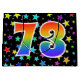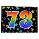 Dieses aufregende, lustige und lebendige Geschenktütendesign besticht durch zahlreiche farbenprächtige Sternenformen und die Zahl "73" mit einem farbenfrohen Regenbogen-inspirierten Farbverlaufsmuster auf schwarzem Hintergrund. Eine Geschenktasche wie diese könnte vielleicht eine lustige Art sein, Geschenke oder Geschenke für jemanden zu verpacken, der zum siebzigsten Geburtstag, oder vielleicht für ein Paar zum siebzigsten dritten Hochzeitstag, oder ein anderes 73. Ereignis. [~Z0000347]