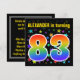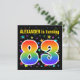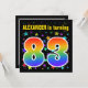 Dieses lustige, lebendige und aufregende Geburtstagsfeierdesign zeichnet sich durch ein farbenfrohes Sternfeld-inspiriertes Muster aus, zusammen mit der Zahl "83" mit einem farbenfrohen Regenbogenmuster wie Spektrum oder Gradientenmuster. Der Name auf der Vorderseite kann angepasst werden. Auf der Rückseite finden Sie benutzerdefinierte Details zum Party. Einladungen für Geburtstagsparty wie diese können potenziellen Teilnehmern für eine Geburtstagsparty geschickt werden, die zur Feier des dreiundachtzigsten Geburtstages von jemandem abgehalten wird. [~Z0000349]