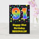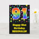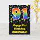 Die Front of this exciting, fun, and vibrant birthday greeting card design feys many colorful star shapes, along with the number "91" featuring a multicolored rainbow inspirred spectrum gradient pattern, wir haben black colored background. Die Front also feature a birthday greeting message, including a customizable recipient name. The inside feature a customizable birthday greeting message, or could perhaps be cleared and left blank if a message is to be written by hand instead. A customizable birthday card like this might be a fun way to acknowledge somebody's ninety first birthday. [~ Z0000348]