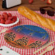 Dieses wunderschöne, tieffarbene Design besteht aus Teepees und Stammestreifen, die kunstvoll mit einem farbenfrohen Hintergrund von Kobaltblau über Lavendel und Rot bis zu verbrannten Orangentönen behandelt wurden. Von Lark Designs entworfen