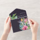 Diese farbenfrohe tropische Blüte | lila Siegel und senden Sie alles in einer Einladung ist perfekt für Ihr modernes boho Ziel, grün, lila, pfirsichfeiern. Das Design besticht durch ein elegantes Bouquet mit klassischem Aquarell und Blume, zu denen u.a. Salbeigrün Eukalyptus, Lila und Rot Protea, rot-rosa Hibiskus, Orange und Blau des Paradieses und dunkelgrüne Palmenblätter zählen. Das Design ist ideal für eine einfache, kreative, einzigartige Reise Hochzeit für Frühling, Sommer, Herbst oder Winter! In der Erholung der Sammlung finden Sie weitere passende oder koordinierende Hochzeitsstätten.