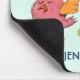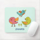 Personalisiertes Mousepad mit einem Trio aus niedlichen und skurrilen, von Hand gezeichnet Vögeln. Zwei der Vögel sind stehend, zusammen mit ein paar winzigen grünen Pinienbäumen zwischen ihren Füßen. Ein anderer blauer Vogel fliegt in der Luft zwischen ihnen hoch. Minz grüner Hintergrund.