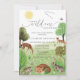 Gender-neutrales modernes und farbenprächtiges Baby-Duschdesign "Ein kleiner Wilder ist unterwegs" in einem eleganten Schriftart mit niedlichen Waldtieren und Vögeln auf einer Wiese mit Bäumen.