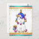 Eine süße, kleine Einhornpostkarte mit einem farbenfrohen Einhorn mit blauen Haaren und goldenem Horn, umgeben von goldenen Glitzer und einem glänzenden aquamarinen, rosa und goldenen Rahmen.