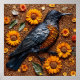 Helle Sonnenblumen und texturierte Samen schaffen einen Hintergrund, der einen schwarzen und orangefarbenen Vogel in einer dekorativen Komposition zeigt. Dieses künstlerische Arrangement vereint lebendige Farben und die Schönheit der Natur in einer kreativen Präsentation.