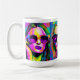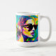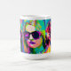 Kreative, einzigartige Kunst Kaffee-Tasse. Farbenfrohe Digitalkunst abstrakt Frauen in Sonnenbrillen. Die verwendeten Farben sind rosa, blau, lila, rot, gelb und limigrün.