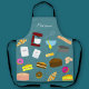 Diese farbenfrohe Backwaren und Backutensilien Schürze hat eine Auswahl an Kuchen, Croissants, Donuts, Backzutaten und Backzubehör auf einem aquamarinen Hintergrund. Die Oberseite hat Platz, um Ihren Namen in Weiß zu personalisieren. Machen Sie diese köstlichen Desserts, Süßigkeiten oder Kuchen. Dies ist ein fabelhaftes Geschenk für einen Koch oder Feinschmecker in der Küche zu tragen. Ein niedliches und farbenfrohes Backdesign.