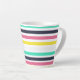Eine farbenfrohe, latte Tasse mit gestreiftem Muster, vorwiegend weiß mit horizontalen Streifen in Schwarz, Rosa, Gelb und Türkis.