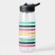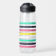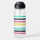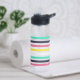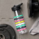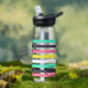 Ein farbenfroher Beutel mit gestreiftem Muster. Der Beutel ist überwiegend weiß mit horizontalen Streifen in Grau, Rosa, Gelb, Türkis und Schwarz.