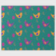 Ein buntes und skurriles Verpackungsmuster aus gelben Hühnern mit blauen Flügeln, rosa Hühnerhühnchen und lila Hühnern mit gelben Flügeln auf einem aquamarinen Hintergrund mit goldenen Blätter, um Ihren Geschenken einen rustikalen, ländlichen Stil.