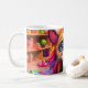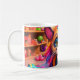 Diese Tasse hat eine farbenfrohe Katze darauf.
