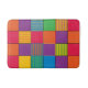 Badematte mit meinem Design von kühnen bunten Quadraten und Streifen in rot, orange, gelb lila, grün und türkis.