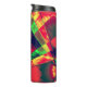Unregelmäßige Quadrate und Rechtecke, einige ausgerichtet, aber schräg. Rot, schwarz, grün, gelb und orange mit Flecken und starken Linien, die die "Objekte" voneinander trennen.