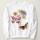Drei schöne und farbenfrohe Schmetterlinge mit einem Bouquet gelber und orangefarbener Blume machen ein schönes Sweatshirt für den Frühling