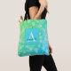 Elegante Script Monogram Tote Bag in Grün- und Blau-Tönen mit Schneeflockendesign. Das Monogramm Initial, Name und vollständiger Name kann personalisiert und auf Ihre Wünsche zugeschnitten werden, indem Sie auf "Personalisieren" klicken. Sie können auch den Schriftart, die Farbe des Schriftartes und die Position ändern, indem Sie auf "Weiter personalisieren" klicken. Ein wunderschönes, stilvolles Geschenk für einen Freund, Familienmitglied oder Kollegen. Sie werden es Liebe geben!