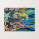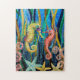 Ein künstlerisches und buntes Design mit Seepferden, umgeben von Pflanze und Algen.