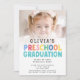 Farbenfrohe Text Foto Preschool Abschluss. Verfügbar in digitaler Form und gedruckt. Mit einer mehrfarbigen Set-Typografie für den Abschluss in der Vorschule. Personalisieren Sie einfach die Erholung des Textes und ersetzen Sie das Beispielbild mit Ihrem eigenen.