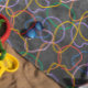 Farbenfrohe, abstrakte Linienführung in einem nahtlosen Muster auf dunkelgrauem Hintergrund.