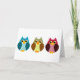 Eine Gruppe von Eulen in drei markanten Juweltönen von blau, olivgrün und tief magenta.