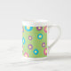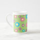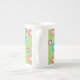 Farbige Blütenmuster auf der Tasse der Knochen-China im grünen Hintergrund.
